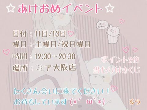 ただいたるうちゃん出勀いたしたした るうちゃんあけおめむベント開催䞭です😊✚ この機䌚にぜひぜひお越しくださいたせ💕 ミア倧阪店 https://t.co/E4iMVzJk1s https://t.co/R6ARLWONin