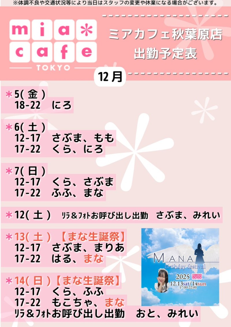 🎍#年賀状📮https://t.co/CjIVfjbH2f ★#メイドカフェ ・ミアカフェ #秋葉原 店★ ☕️営業予定日☕️ 🎀12月12日(金)  リラ&フォトお呼び出し出勤 さぶま、みれい 🎀12月13日(土)  12-17 さぶま,まりあ  17-22 🎂まな,はる 🎀12月14日(日)  12-17 くら,ふふ  17-22 🎂まな,もこちゃ #生誕祭 https://t.co/lyQuFXVzNt