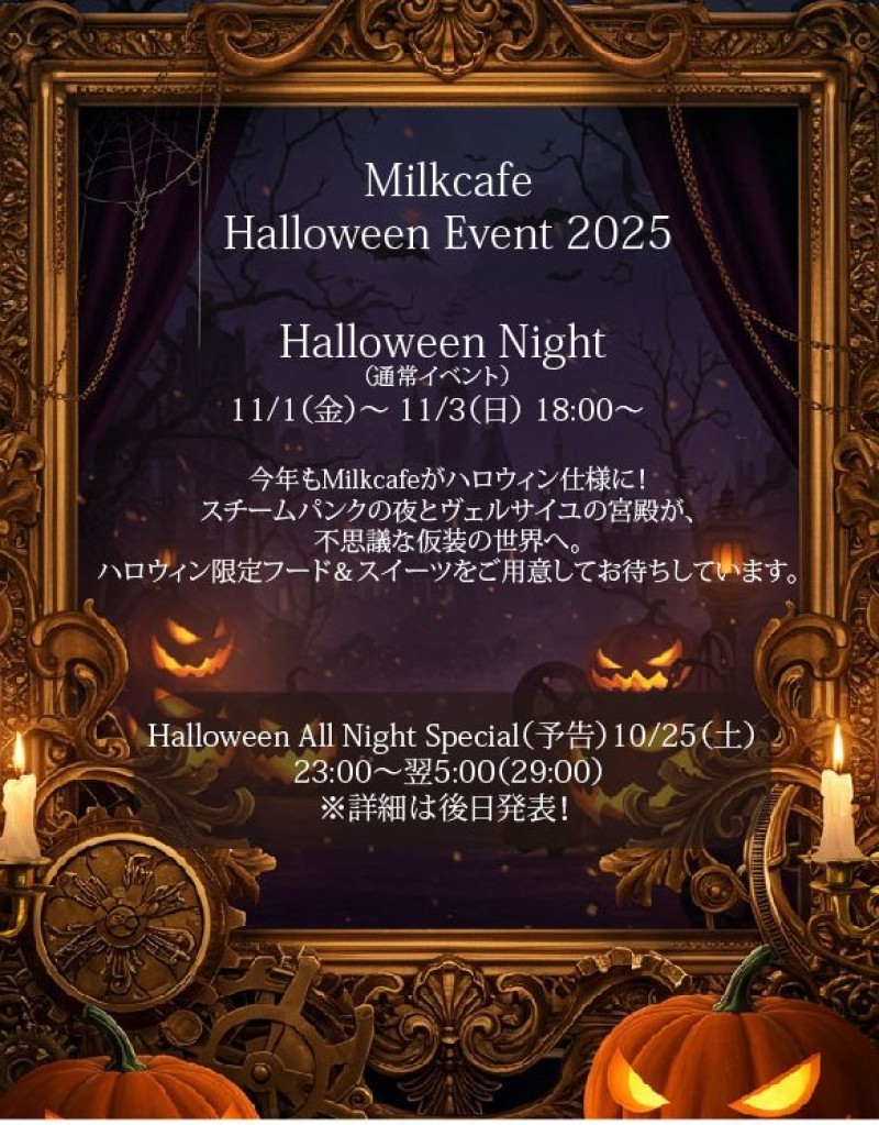 🎃 Milkcafe Halloween Event 2025🎃 🕯異なるふた぀のハロりィン🕯 👻 Halloween Night通垞むベント 📅 11/1金〜 11/3日 ⏰ 18:00〜 今幎もMilkcafeがハロりィン仕様に スチヌムパンクの倜ずノェルサむナの宮殿が、䞍思議な仮装の䞖界ぞ。 https://t.co/iBOMkEHnNH
